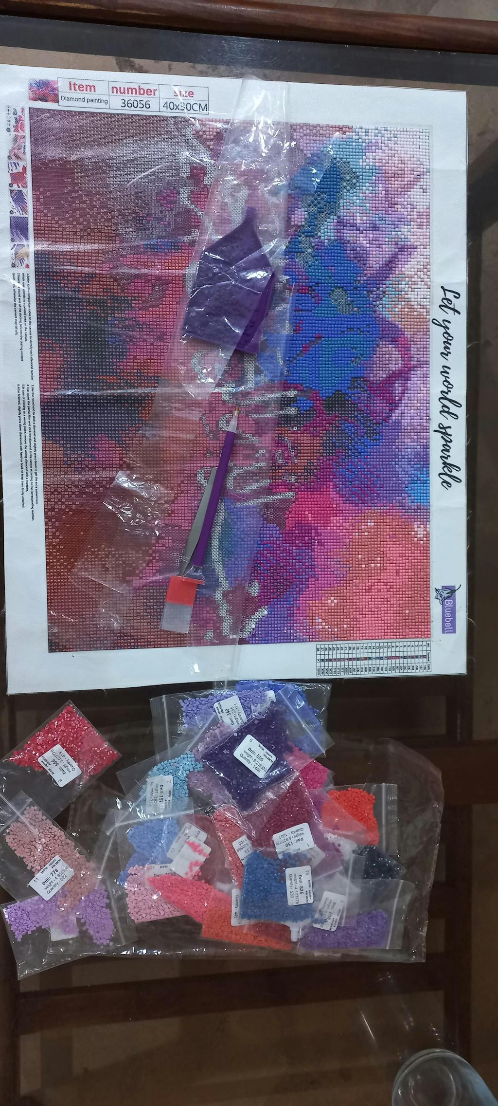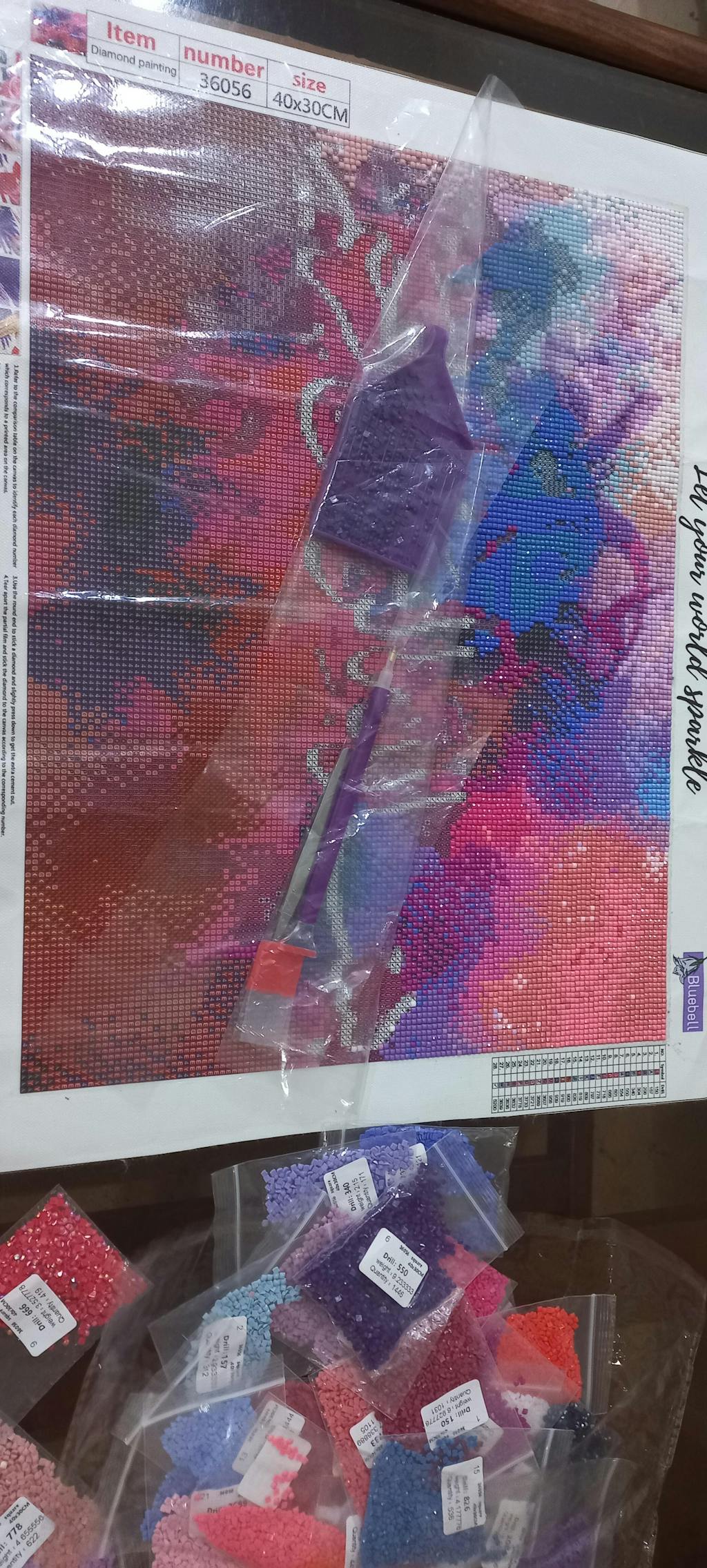 Package comes with 1x soft to-touch painting canvas, Diamond-cut color beads, 1X sticky pen, 1x flat plastic tray, 1x Glue/Wax
